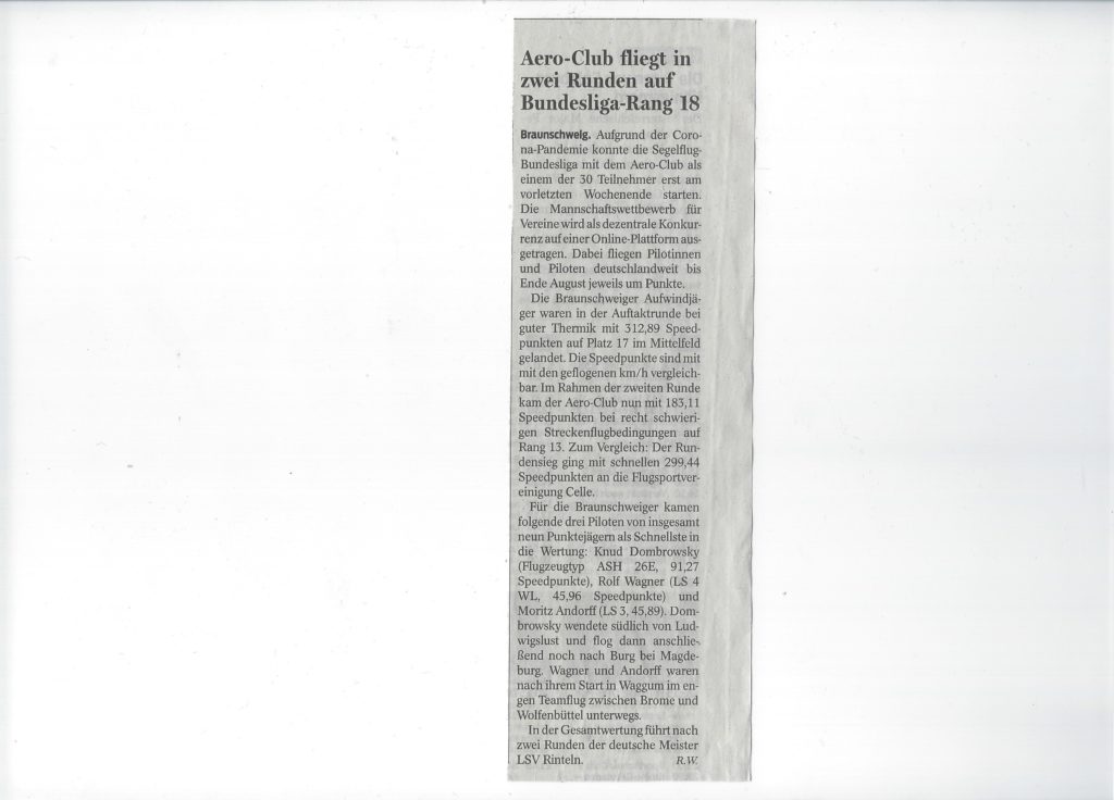 In dieser Rubrik möchten wir aktuell über unser Abschneiden in der 1. Segelflugbundesliga berichten. Dazu ganz kurz: Was ist die Segelflug-Bundesliga? Die Segelflug-Bundesliga (OLC-League) Eine relativ junge Variante des Streckensegelfluges ist die 2001 ins Leben gerufene Segelflug-Bundesliga (OLC-League). Dieser Mannschaftswettbewerb für Vereine wird als dezentraler Wettbewerb auf einer Online-Plattform ausgetragen. Dabei fliegen die Piloten deutschlandweit in circa 19–20 Wochenrunden um die Punkte. Gewertet werden die jeweils drei schnellsten Flüge eines Vereines, wobei die Berechnung der Geschwindigkeit in einem Zeitfenster von zweieinhalb Stunden erfolgt und dieser Schnitt mit einem Flugzeugindex bewertet wird. Gewertet wird in der 1. Bundesliga (circa 30 Vereine), der 2. Bundesliga (circa 30 Vereine), der Quali-Liga (circa 500 Vereine) und der jeweiligen Landesliga der 16 Bundesländer. Unsere Heimatstadt und Startort Braunschweig